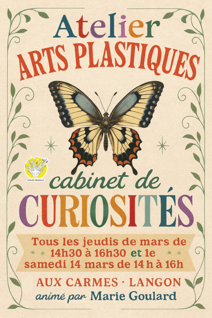 En plus des ateliers dessin et peinture hebdomadaires, nous vous proposons des ateliers à la journée, mensuels, l’idéal pour approfondir une pratique (image animée un weekend par mois, Sumi-e un dimanche par mois). De plus, un atelier Peinture et Techniques mixtes ouvre le samedi après-midi une fois tous les 15 jours. Enfin, Marie Goulard, nouvelle intervenante, proposera des ateliers créatifs pour les adultes et les enfants.